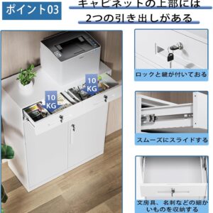CYFIE スチールロッカー 3段 引き出し付き 鍵付き キャビネット 棚板可動 幅900×奥行400×高さ1090mm A4対応 ホワイト