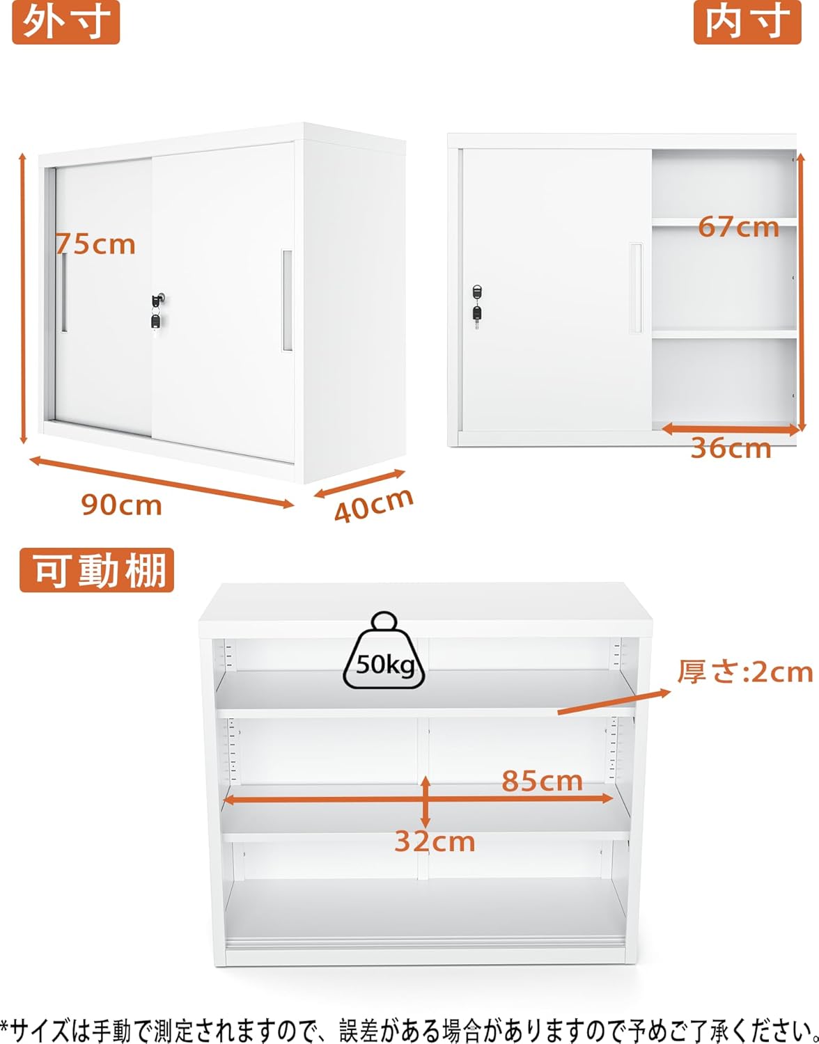 - ✅【商品仕様】◆外寸:幅900×奥行400×高さ750mm ◆重量:24kg ◆梱包重量:28.5kg ◆耐荷重:約50kg※棚板1枚あたり。◆材質:本体・扉/スチール製、粉体塗装 ◆棚板上下可動 ◆鍵は、合計2個付属します。◆お客様組立品